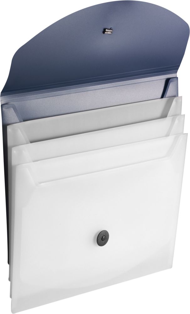 Transparentní polypropylenové pouzdro na dokumenty se 4 kapsami a zapínáním na gumičku. Rozměry 32x22,5x1 cm. Modrá barva.