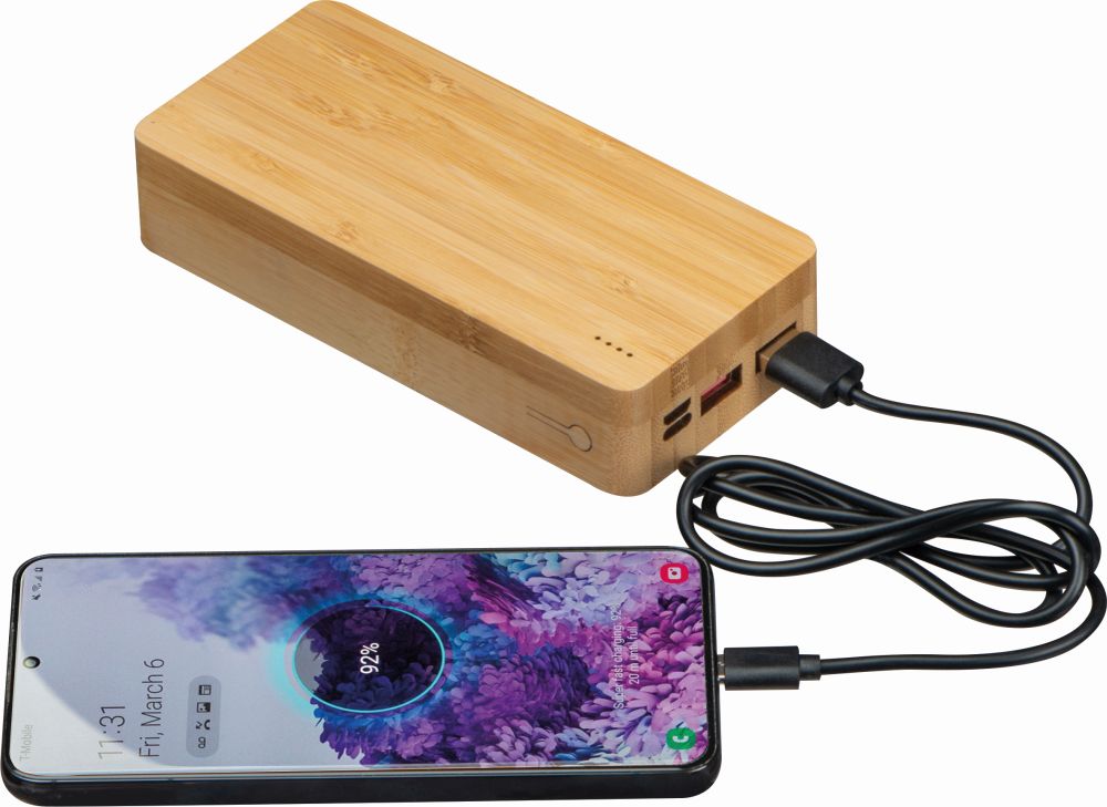Výkonná bambusová powerbanka s kapacitou 20 000 mAh / 3,7 V / 74 W. Power banka má vstup typu C a USB a dodává se s nabíjecím kabelem USB-C. Rozměry: 14,5 x 6,7 x 3 cm