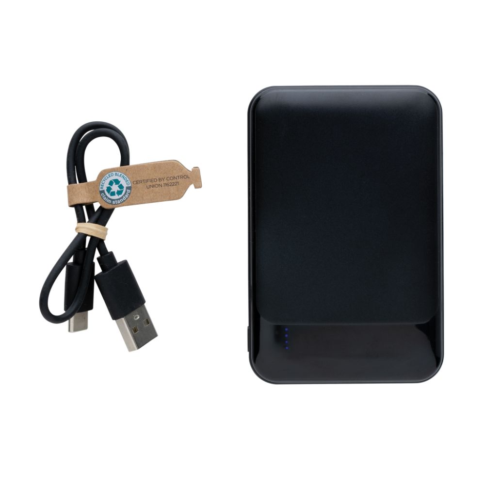 Kapesní powerbanka s kapacitou 5 000 mAh vyrobená z recyklovaného ABS plastu s RCS certifikací. RCS (Recycled Claim Standard) je globální standard, který umožňuje ověřit použití recyklovaného materiálu v produktu napříč celým dodavatelským řetězcem. Celkový podíl recyklátu dle váhy produktu: 22 %. Kvalitní lithium polymerová baterie řady A s kapacitou 5 000 mAh plně nabije mobilní telefon až 2x. Světelné indikátory stupně nabití. Micro USB vstup: 5V/2A, USB C vstup: 5V/2,4A. USB A výstup: 5V/2,4A, USB C výstup: 5V/2A. Včetně nabíjecího kabelu z recyklovaného TPE. Výrobek je kompletně bez PVC. Baleno v FSC kraftové dárkové krabičce. Rozměry: 9.8 x 6.5 x 1.6 cm .