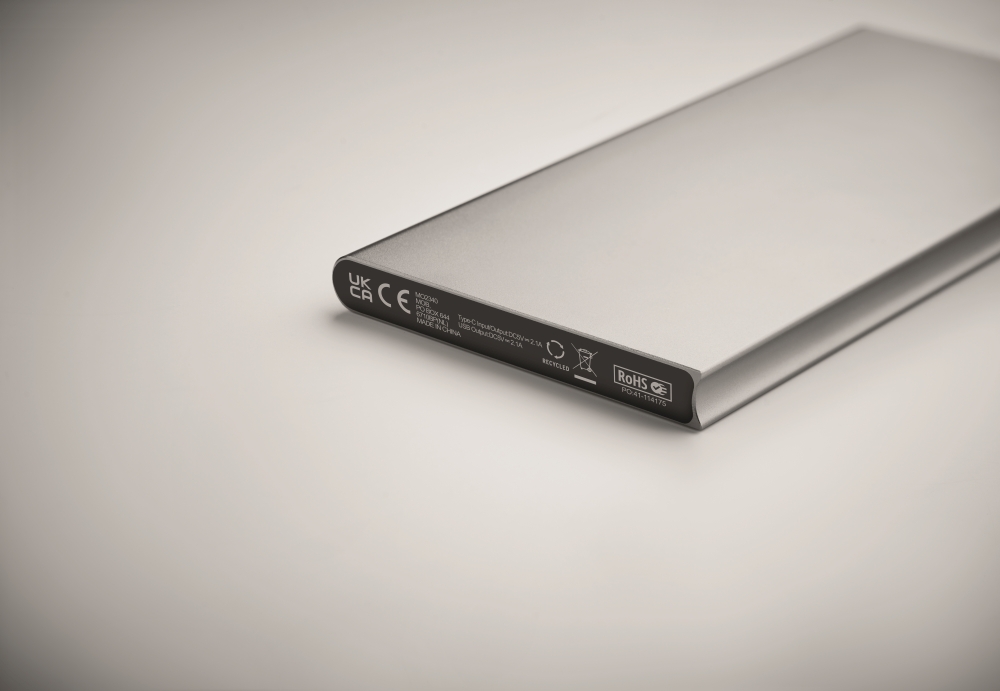 Powerbanka 8000 mAh z recyklovaného hliníku. Kapacita pro použití se smartphonem, výstupní proud DC5V/2A. Včetně nabíjecího kabelu USB typu C. Vstup/výstup: USB Type-C. Rozměry: 7,5 x 15,2 x 0,9 cm. Materiál: recyklovaný hliník