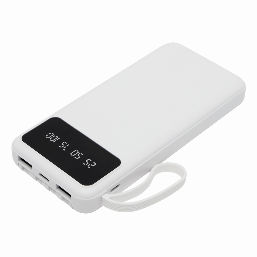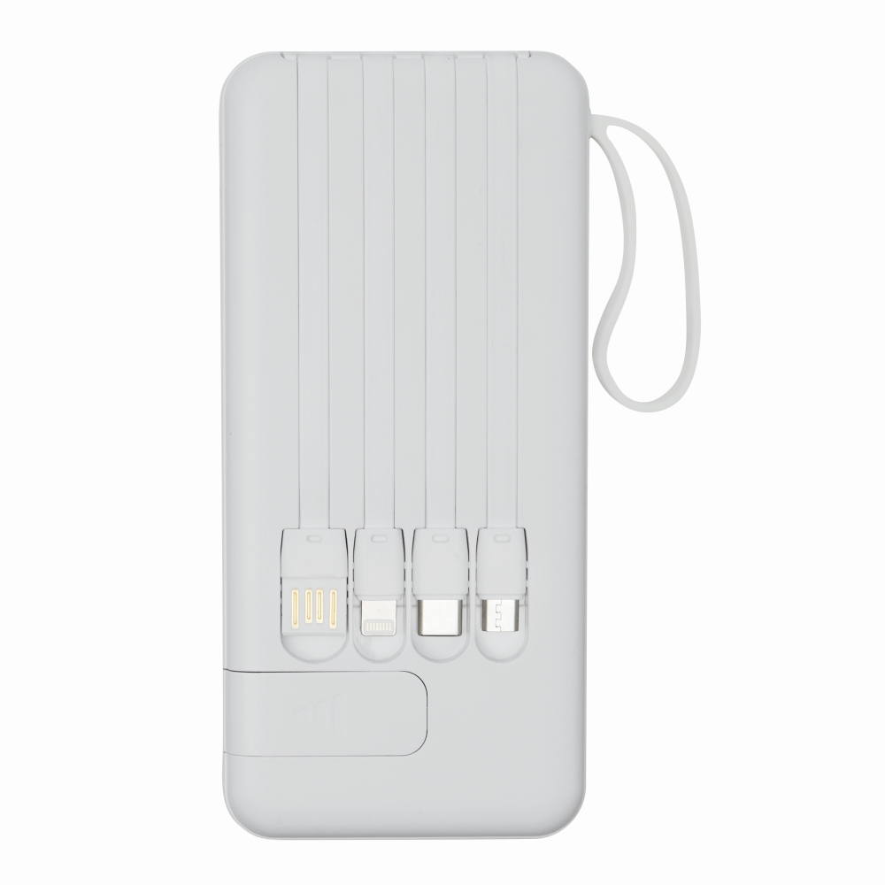 Powerbanka vhodná pro chytré telefony a zařízení připojená přes USB, 1 USB Type-C a 2 Type-A výstupy, kapacita: 10 000 mAh, 4 integrované nabíjecí kabely na zadní straně (Type-C, Micro -USB, Lightning a USB Type-A, indikátor úrovně nabití (25 / 50 / 75 / 100%), výkonná baterie, příkon: 5V/2A, výstupní výkon: 5V/2A (max.), s výsuvem držák smartphonu, s vypínačem. Rozměry: 14,7 x 6,8 x 1,9 cm