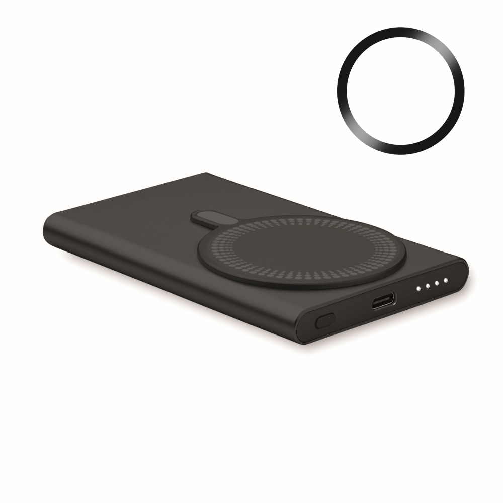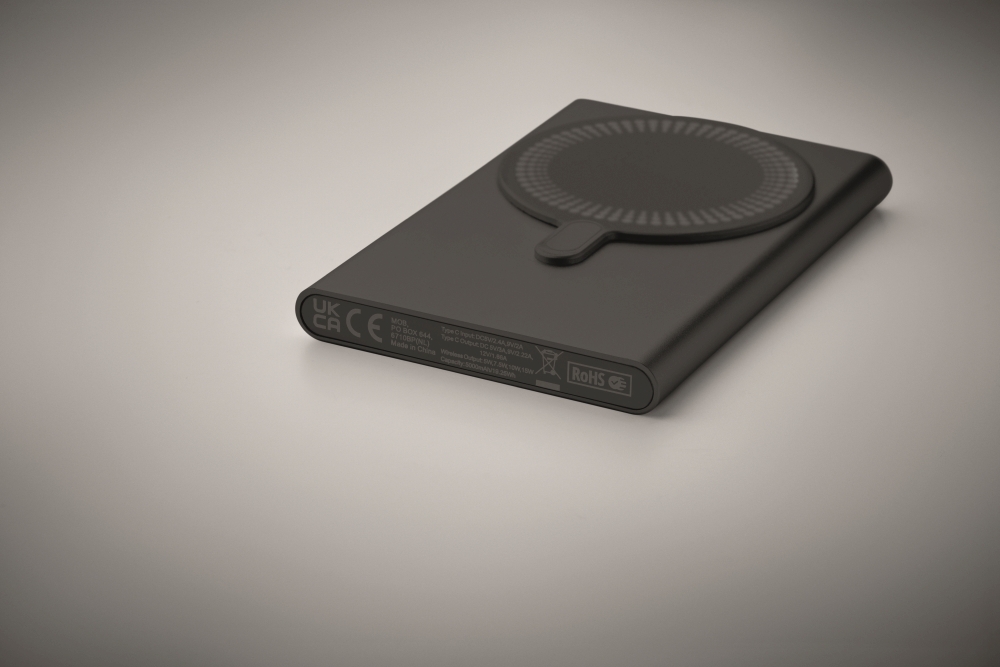 Magnetická bezdrátová nabíječka (15W) a powerbanka (5000 mAh) z recyklovaného hliníku. Výstup: DC 9V/1,66A. Podporuje technologii rychlého nabíjení (20W). Vstup/výstup: Type-C. Podpora technologie Power Delivery (PD) pro nabíjení nejnovějších notebooků MacPro®. Včetně magnetického kroužku pro podporu nabíjení jiných nemagnetických bezdrátově nabíjitelných telefonů. Rozměry: 6,7 x 10,2 x 0,95 cm
