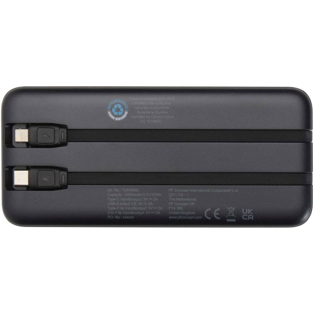 Powerbanka z recyklovaného plastu s kapacitou 10 000 mAh a výkonem 10 W se dvěma vestavěnými kabely, černá