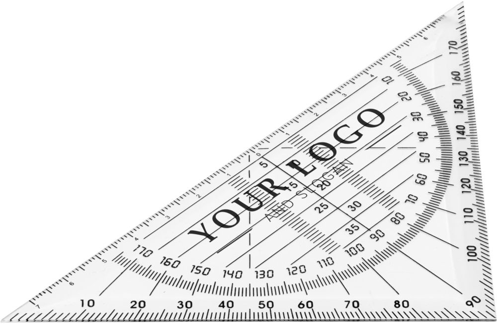 Transparentní pravítko- trojúhelník s úhloměrem.