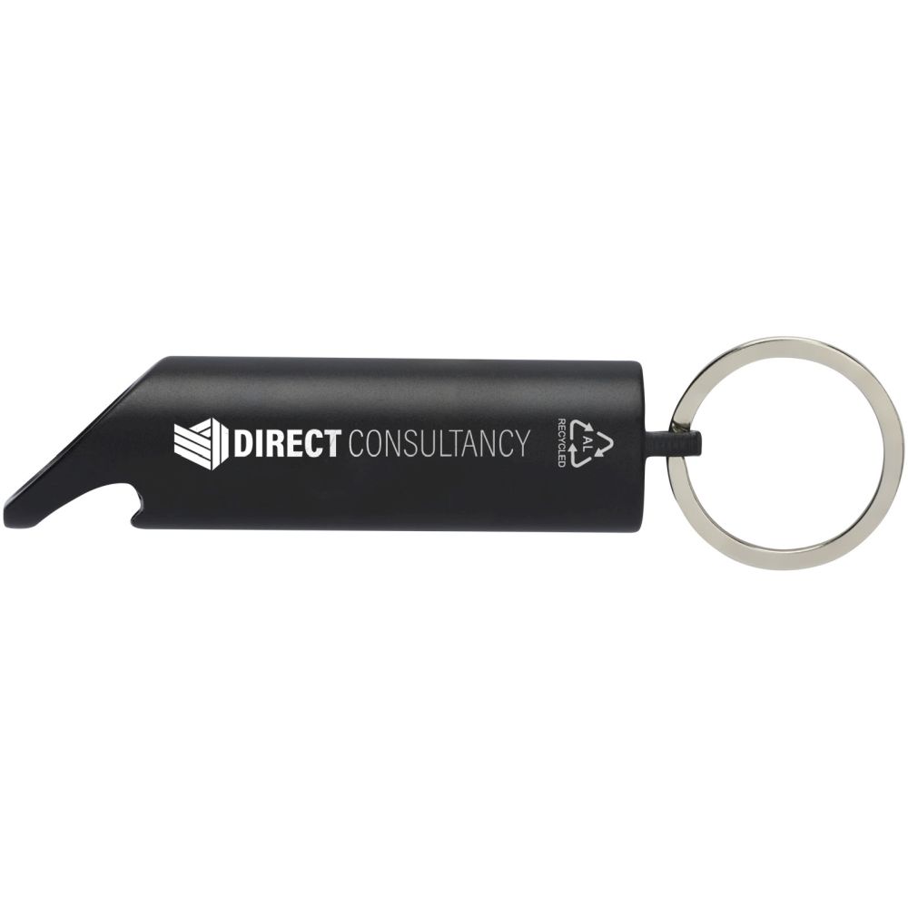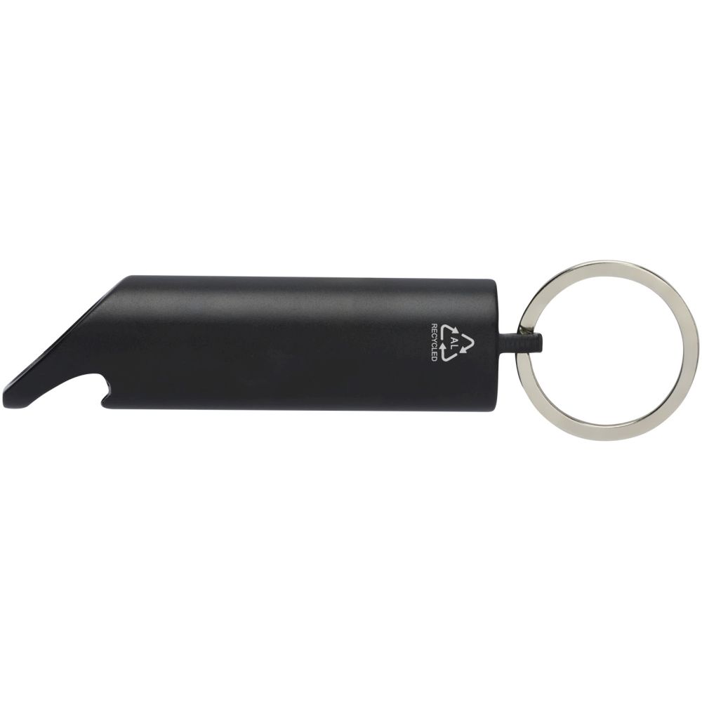 Jasná LED klíčenka s otvírákem na láhve, tlačítkem pro zapnutí/vypnutí a železným kroužkem na klíče. Je vyrobeno z lehkého a pevného 63% RCS certifikovaného recyklovaného hliníku. Standard Recycled Claim Standard (RCS) ověřuje recyklovaný obsah produktu v celém dodavatelském řetězci. K dispozici v různých výrazných barvách s kovovým povrchem, díky nimž tištěné logo krásně vynikne. Dodává se se třemi bateriemi LR44. Rozměry: 8,5 x O 2,1 cm.