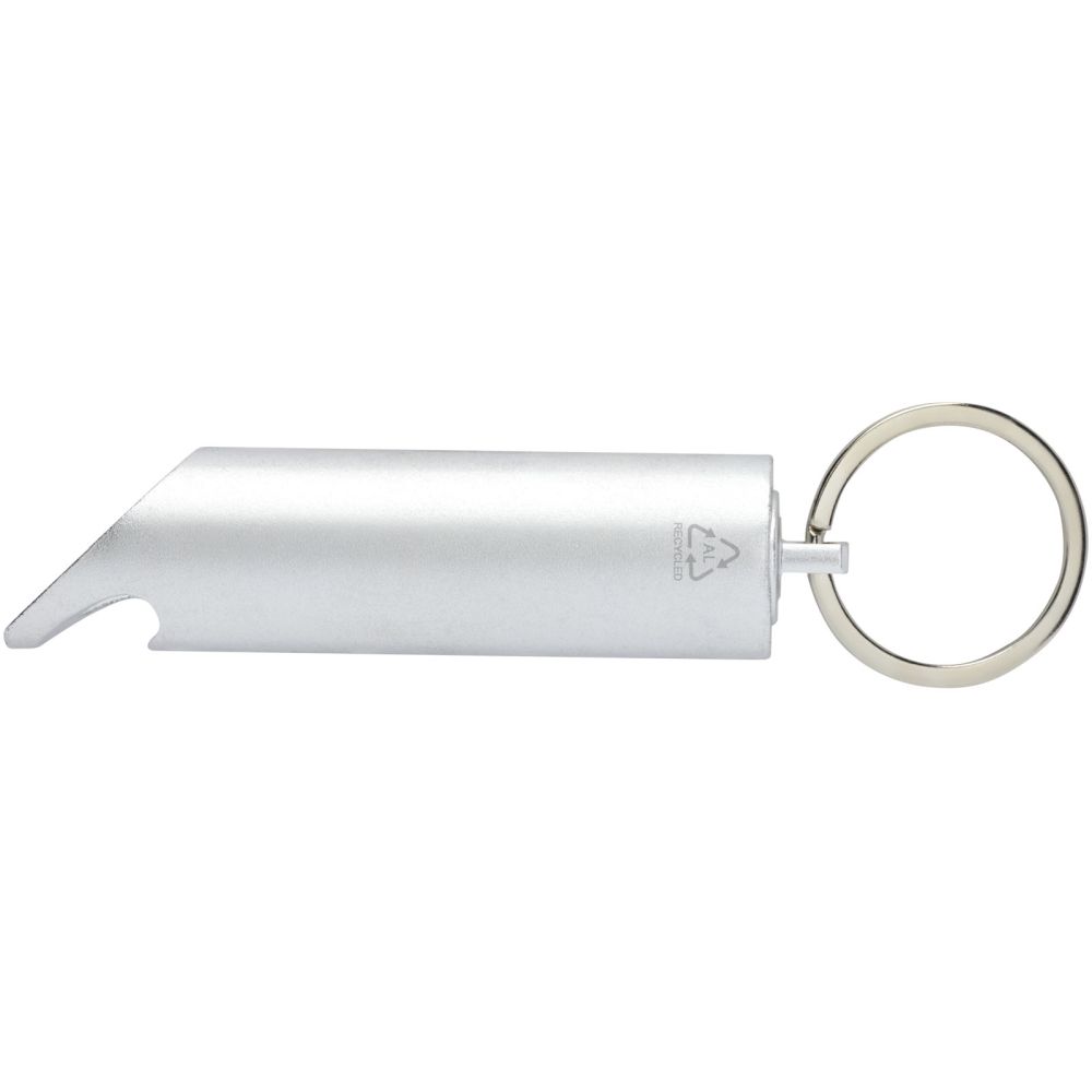 Jasná LED klíčenka s otvírákem na láhve, tlačítkem pro zapnutí/vypnutí a železným kroužkem na klíče. Je vyrobeno z lehkého a pevného 63% RCS certifikovaného recyklovaného hliníku. Standard Recycled Claim Standard (RCS) ověřuje recyklovaný obsah produktu v celém dodavatelském řetězci. K dispozici v různých výrazných barvách s kovovým povrchem, díky nimž tištěné logo krásně vynikne. Dodává se se třemi bateriemi LR44. Rozměry: 8,5 x O 2,1 cm.