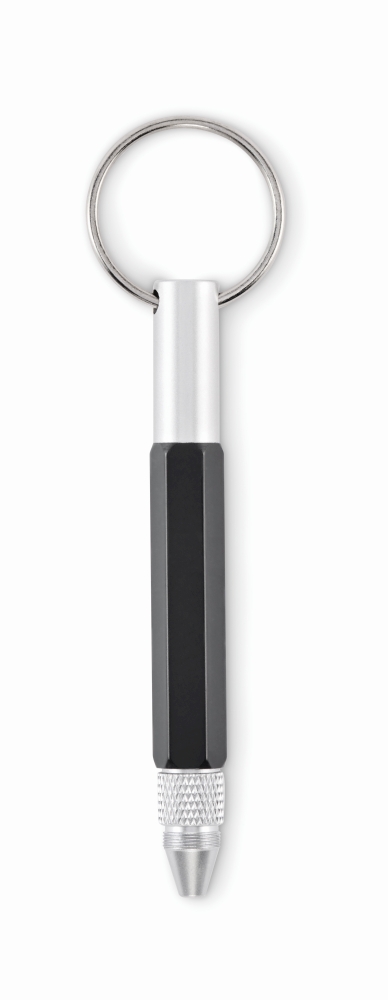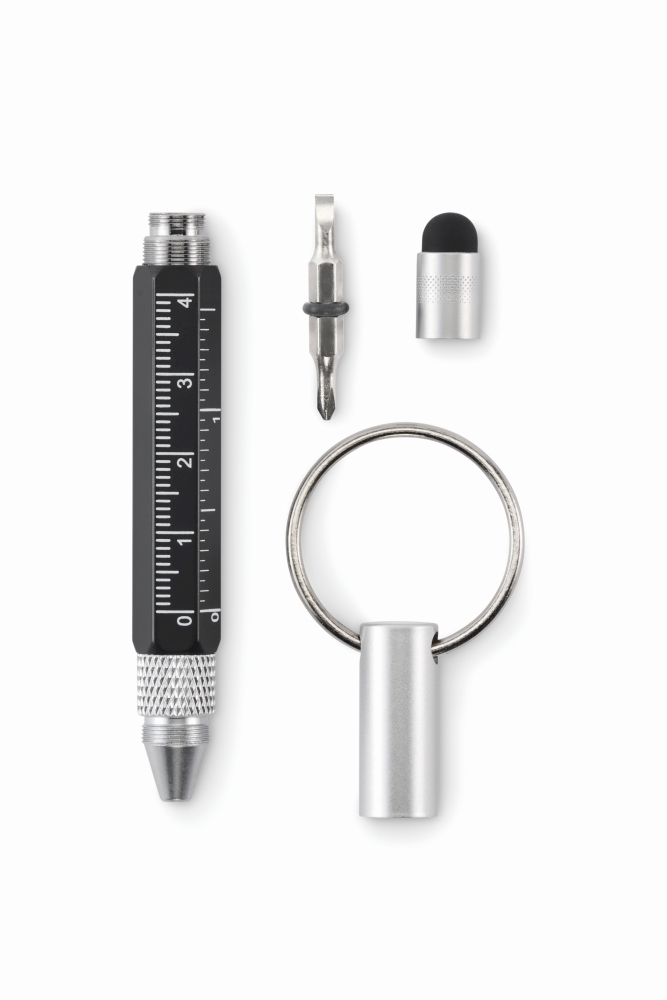 Přívěsek na klíče, propiska, pravítko 4 cm a 1,5 palce, stylus, křížový a plochý šroubovací bit 2v1. Černý inkoust. Vyrobeno z recyklovaného hliníku. Rozměry: O 1,1 x 11,7 cm
