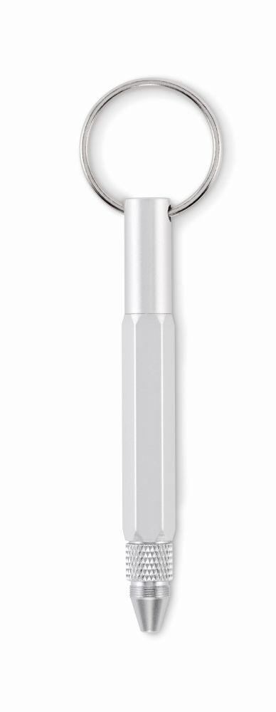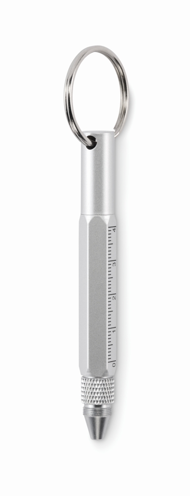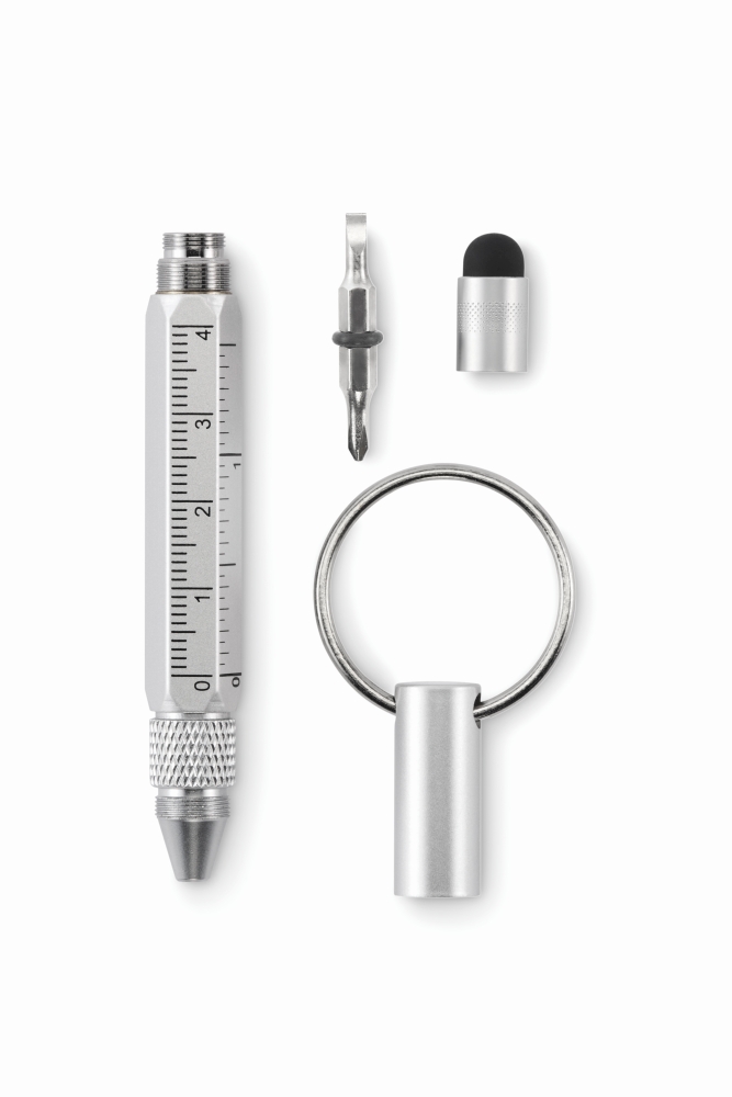 Přívěsek na klíče, propiska, pravítko 4 cm a 1,5 palce, stylus, křížový a plochý šroubovací bit 2v1. Černý inkoust. Vyrobeno z recyklovaného hliníku. Rozměry: O 1,1 x 11,7 cm