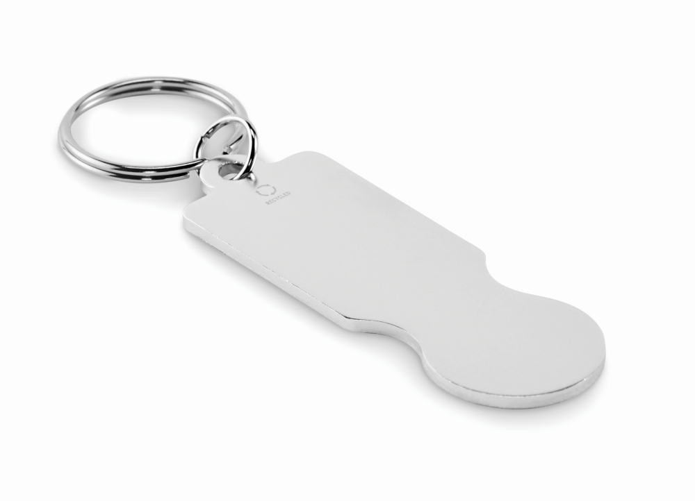 Přívěsek na klíče sloužící jako žeton do nákupního košíku. Rozměry: 6,9 × 2,3 cm.