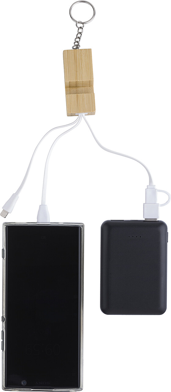 Přívěšek na klíče s bambusovým stojánkem na telefon a s nabíjecími kabely s koncovkami USB-C, lightning a USB-A/C. Jednotlivě baleno v hnědém kartonovém sáčku. Rozměry: 17 cm