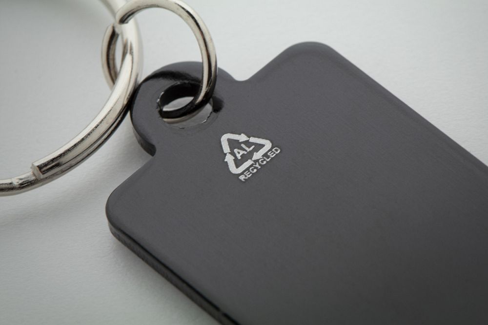 Přívěšek na klíče z recyklovaného hliníku s mincí do nákupního vozíku. Rozměr: 23×69×2 mm