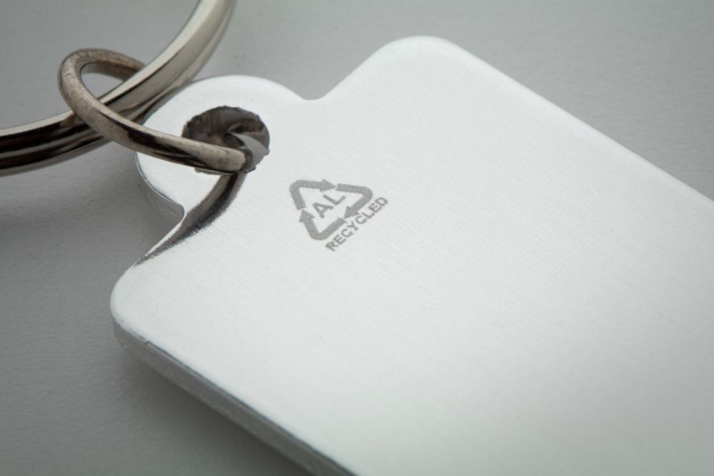 Přívěšek na klíče z recyklovaného hliníku s mincí do nákupního vozíku. Rozměr: 23×69×2 mm