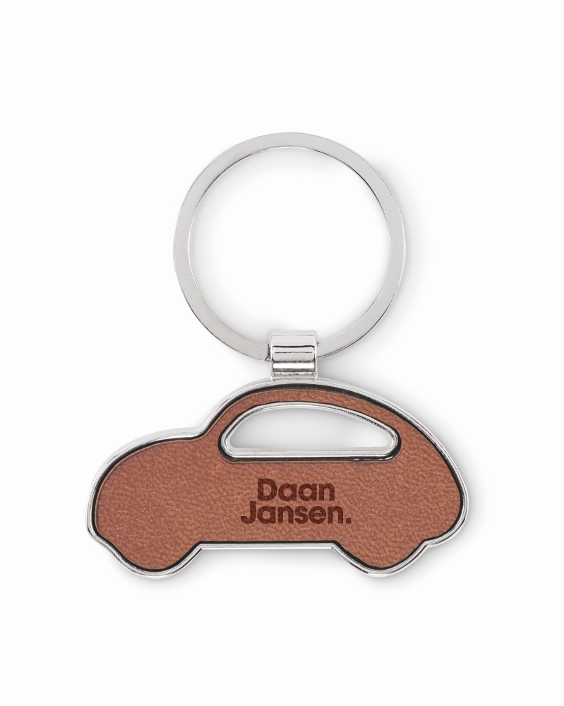 Kovová klíčenka ve tvaru auta s vložkou z recyklované PU kůže. Rozměry: 6,7 x 5,7 cm