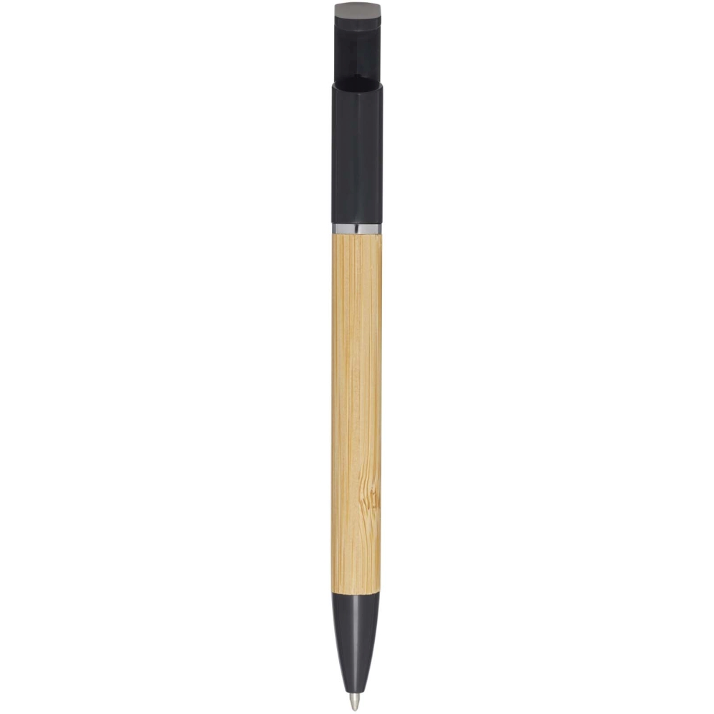 Bambusová propiska, která funguje také jako držák na telefon. Tlačítko a středový kroužek jsou vyrobeny z recyklovaného plastu, hrot z mosazi a tělo z bambusu z odpovědných zdrojů. Barva inkoustu: Modrá. Délka psaní: 1000 metrů. Rozměr hrotu: 1,0 mm. Rozměry: 14,7 x O 1 cm