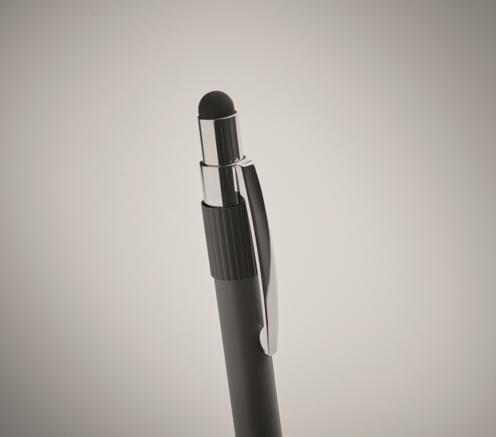 Kuličková propiska z recyklovaného hliníku. Se stylusem s antistresovým spinnerem. Modrý inkoust. Rozměry: O 1 x 14,8 cm