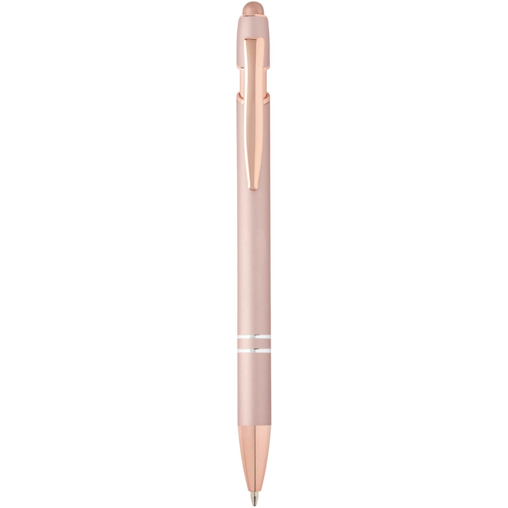 Propiskas povrchovou úpravou z růžového zlata má tělo vyrobené z recyklovaného hliníku a dotykový stylus vyrobený ze silikonu. Snižuje také množství odpadu na skládkách a pomáhá šetřit přírodní zdroje s cílem snížit emise skleníkových plynů. Barva inkoustu: Černá. Délka psaní: 800 metrů. Rozměr hrotu: 1,0 mm. Rozměry: 14,4 x O 1 cm