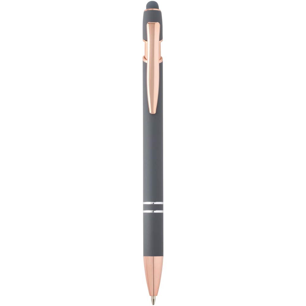 Propiska s povrchovou úpravou z růžového zlata má tělo vyrobené z recyklovaného hliníku a dotykový stylus vyrobený ze silikonu. Snižuje také množství odpadu na skládkách a pomáhá šetřit přírodní zdroje s cílem snížit emise skleníkových plynů. Barva inkoustu: Modrá. Délka psaní: 800 metrů. Rozměr hrotu: 1,0 mm. Rozměry: 14,4 x O 1 cm