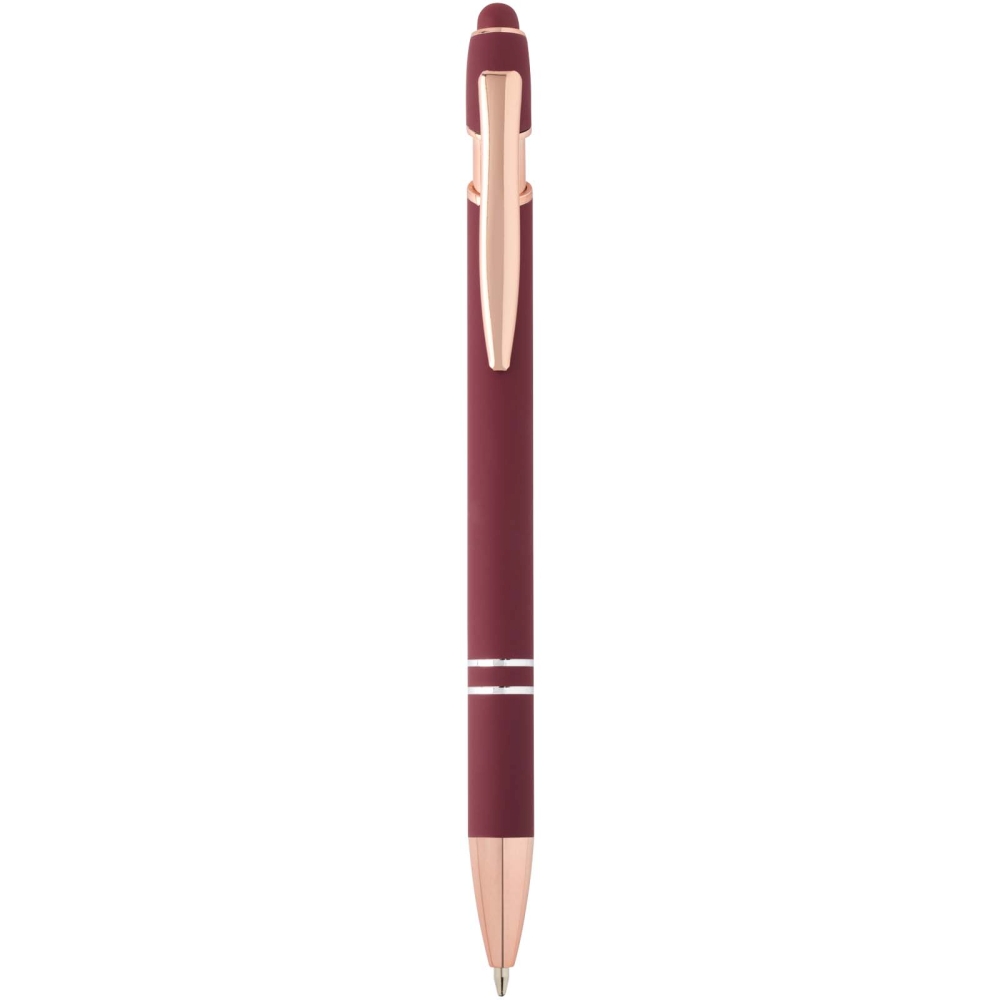 Propiska s povrchovou úpravou z růžového zlata má tělo vyrobené z recyklovaného hliníku a dotykový stylus vyrobený ze silikonu. Snižuje také množství odpadu na skládkách a pomáhá šetřit přírodní zdroje s cílem snížit emise skleníkových plynů. Barva inkoustu: Modrá. Délka psaní: 800 metrů. Rozměr hrotu: 1,0 mm. Rozměry: 14,4 x O 1 cm