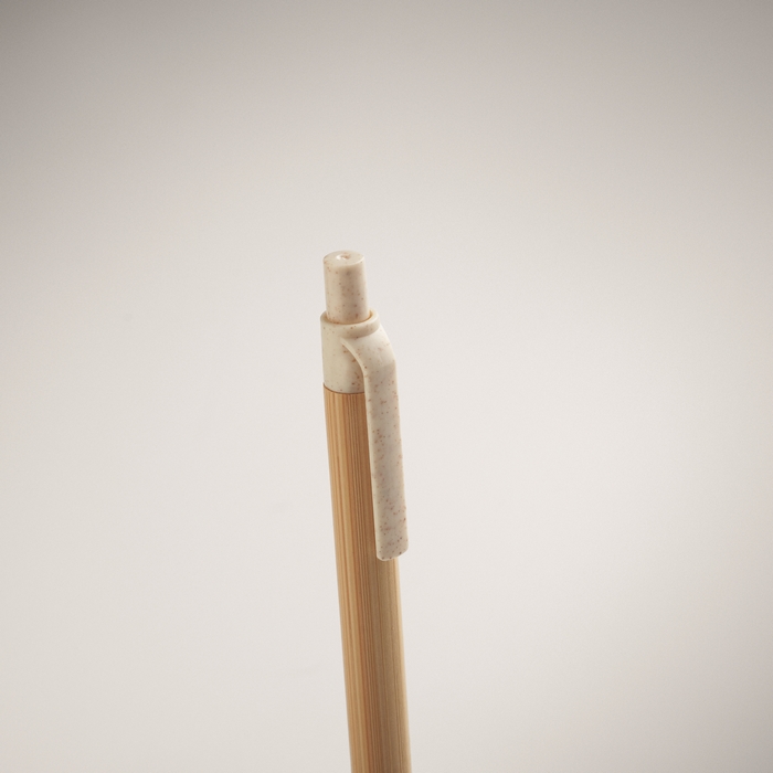 Tlačítková propiska s bambusovým tělem a doplňky z pšeničné slámy (50%) a plastu ABS (50%). Modrý inkoust.Rozměry: 14 x ?1cm