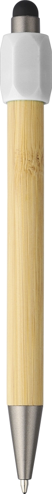 Bambusová propiska s funkcí otáčení spinneru z recyklovaného ABS plastu a černým stylusem na tlačítku. Má tlačítkový mechanismus, hrot o velikosti 1,0 mm a modrý inkoust. Součástí je logo z recyklovaného ABS plastu. Rozměry: 14,8 x 1,1 x 1,4 cm