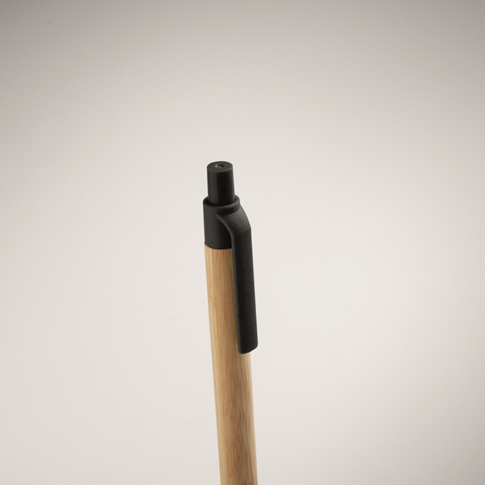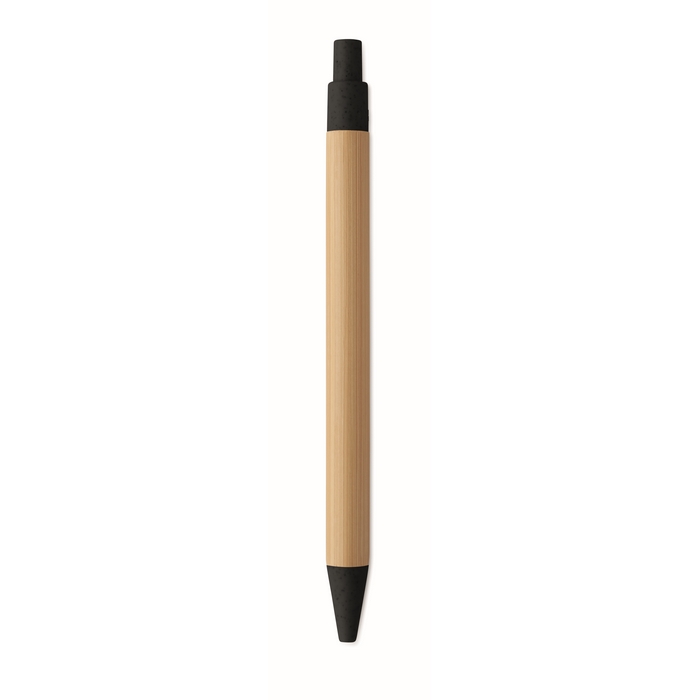 Tlačítková propiska s bambusovým tělem a doplňky z pšeničné slámy (50%) a plastu ABS (50%). Modrý inkoust.Rozměry: 14 x ?1cm
