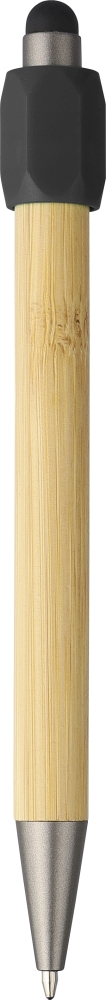 Bambusová propiska s funkcí otáčení spinneru z recyklovaného ABS plastu a černým stylusem na tlačítku. Má tlačítkový mechanismus, hrot o velikosti 1,0 mm a modrý inkoust. Součástí je logo z recyklovaného ABS plastu. Rozměry: 14,8 x 1,1 x 1,4 cm