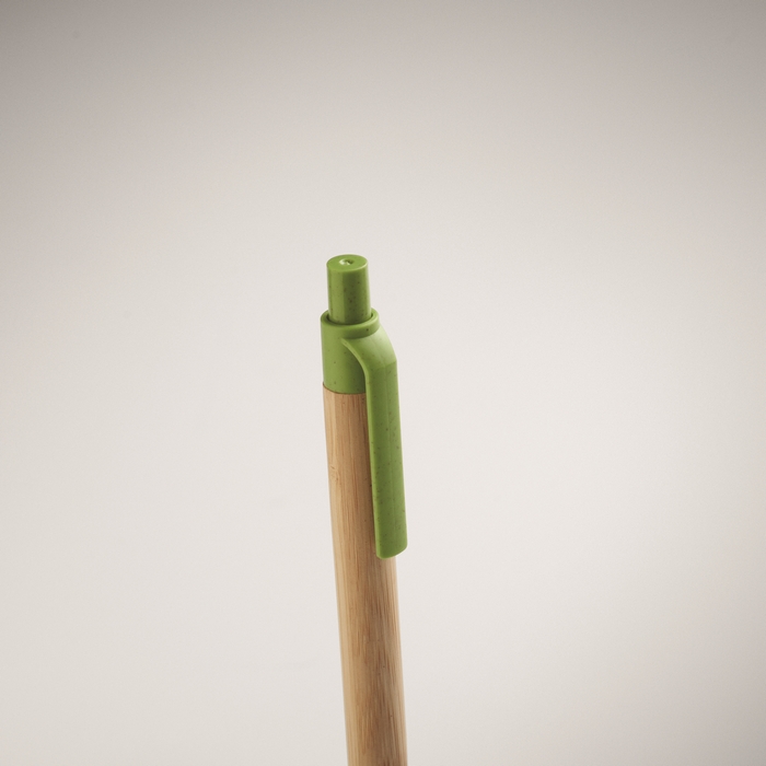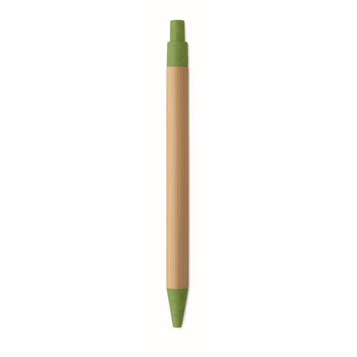 Tlačítková propiska s bambusovým tělem a doplňky z pšeničné slámy (50%) a plastu ABS (50%). Modrý inkoust.Rozměry: 14 x ?1cm