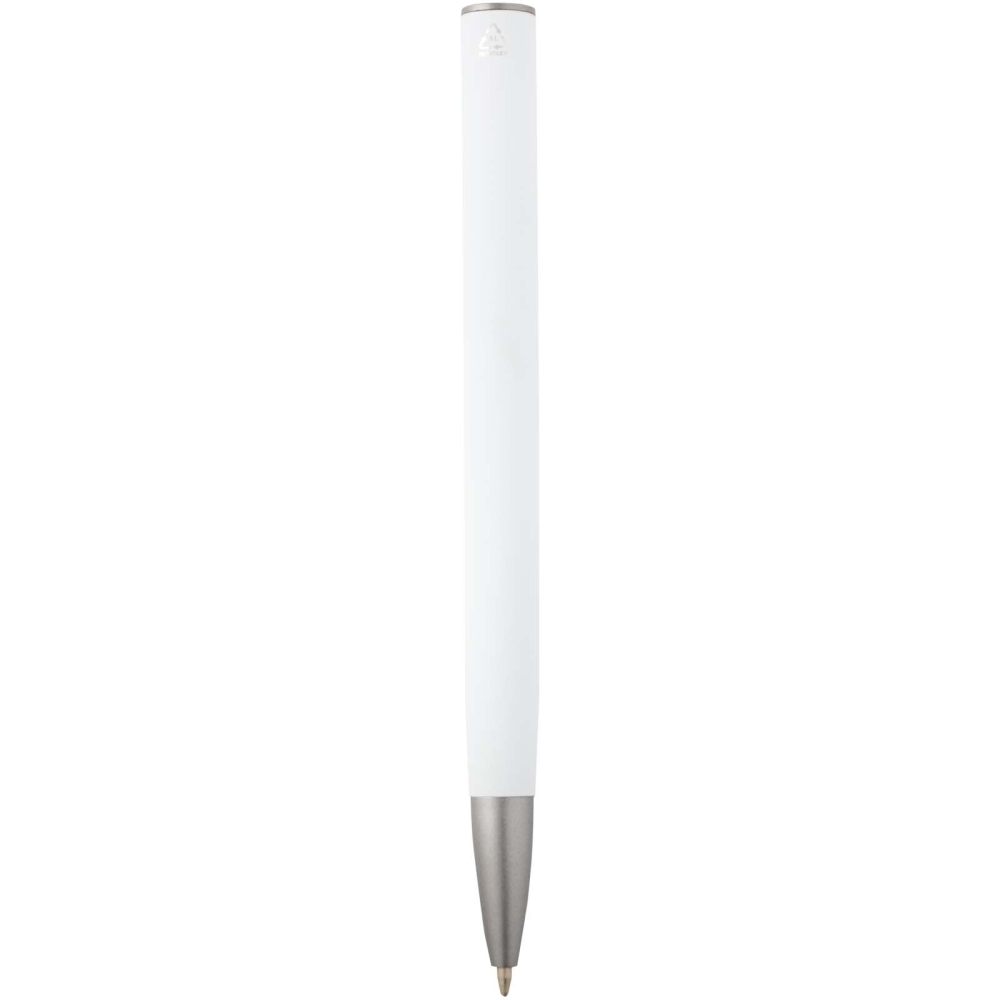 Propiska s tělem z recyklovaného hliníku a stříbrným klipem z ABS plastu. Barva inkoustu: Modrá. Délka psaní: 800 metrů. Rozměr hrotu: 1,0 mm. Rozměry: 14 x O 1,1 cm