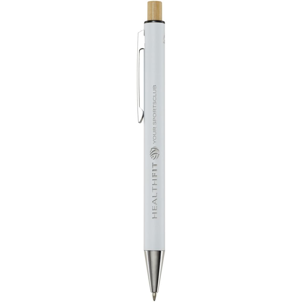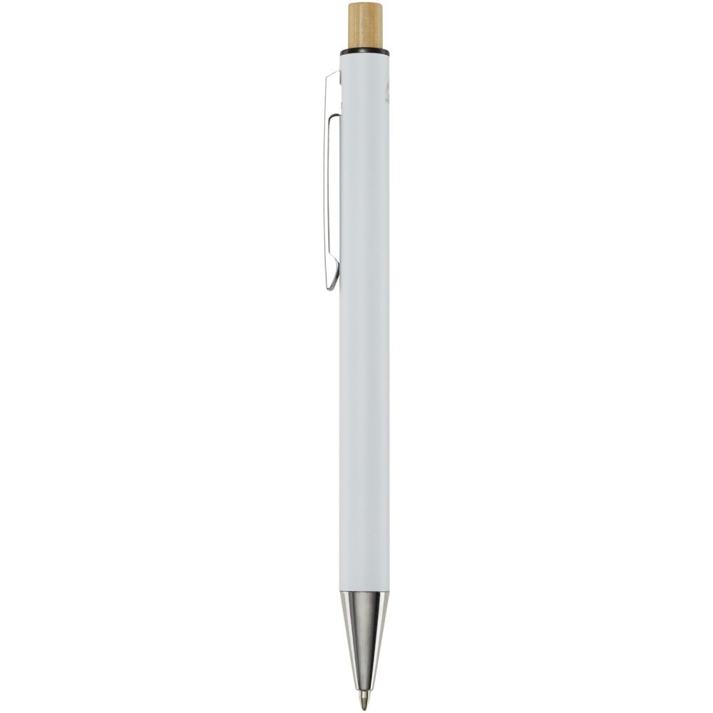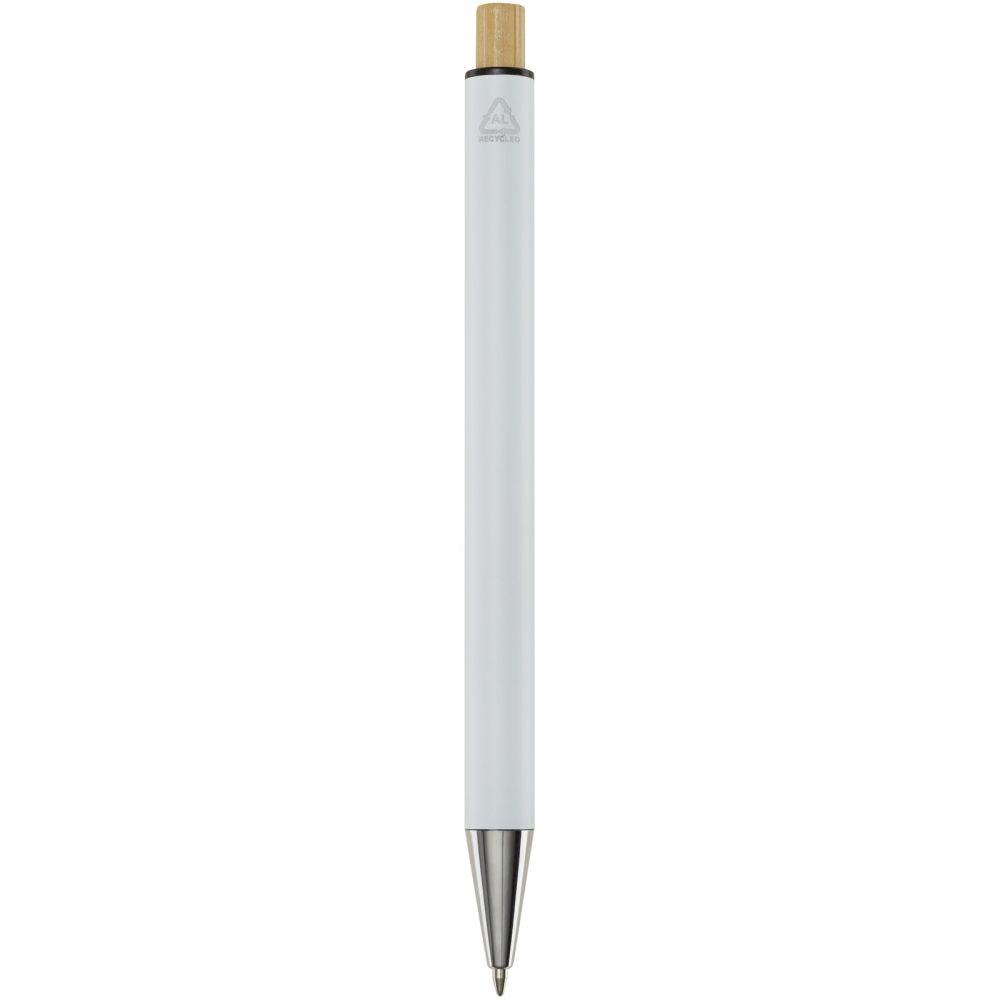 Kuličkové pero je vyrobeno z recyklovaného hliníku, což vyžaduje méně energie než výroba hliníku z nerostných surovin. Snižuje také množství odpadu na skládkách a pomáhá šetřit přírodní zdroje s cílem snížit emise skleníkových plynů. Tlačítko je vyrobeno z bambusu. Barva inkoustu: Modrá. Délka psaní: 800 metrů. Rozměr hrotu: 1,00 mm. Rozměry: 13,9 x O 1,02 cm.