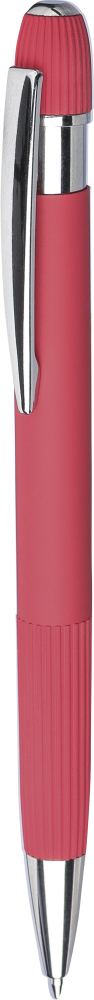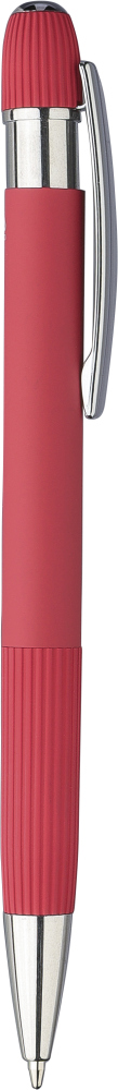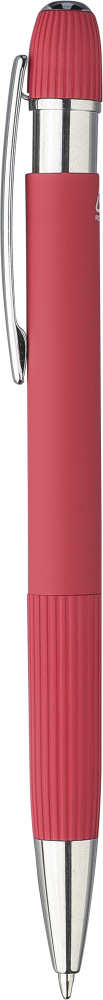 Propiska z recyklovaného hliníku s pogumovanou úpravou. S pruhovanými detaily na úchopu a horní straně, chromovanou plastovou špičkou a tlačítkem s kovovým klipem. Součástí je laserem gravírované recyklované logo. Modrý inkoust. Rozměry: 14,3 x 1,5 cm