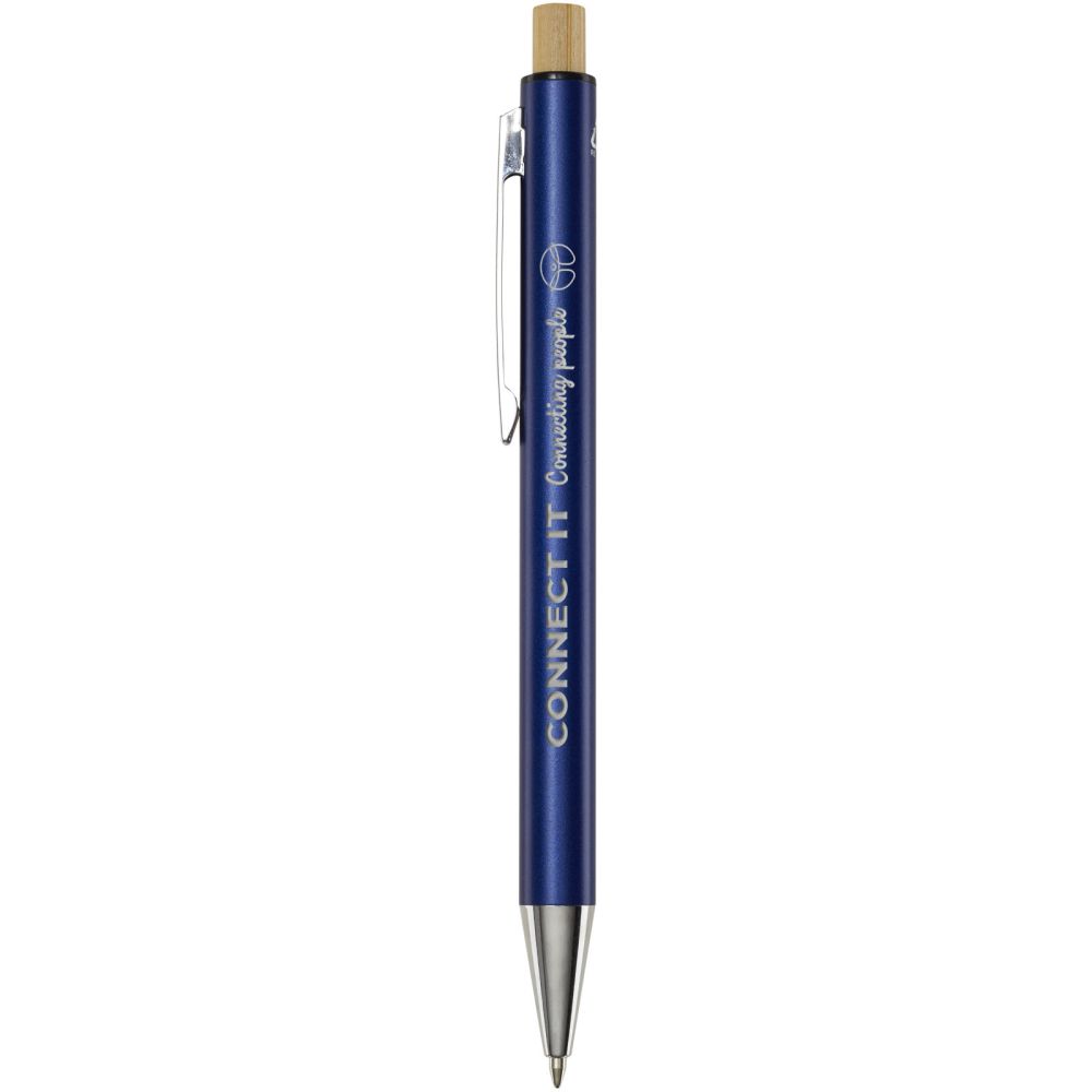 Kuličkové pero je vyrobeno z recyklovaného hliníku, což vyžaduje méně energie než výroba hliníku z nerostných surovin. Snižuje také množství odpadu na skládkách a pomáhá šetřit přírodní zdroje s cílem snížit emise skleníkových plynů. Tlačítko je vyrobeno z bambusu. Barva inkoustu: Modrá. Délka psaní: 800 metrů. Rozměr hrotu: 1,00 mm. Rozměry: 13,9 x O 1,02 cm.