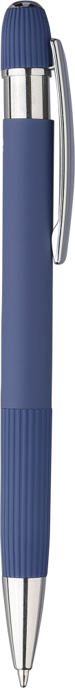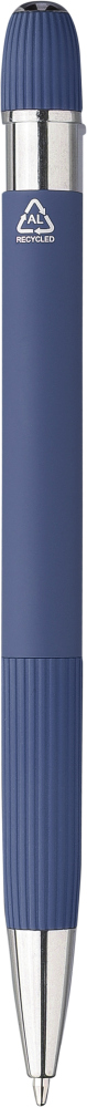 Propiska z recyklovaného hliníku s pogumovanou úpravou. S pruhovanými detaily na úchopu a horní straně, chromovanou plastovou špičkou a tlačítkem s kovovým klipem. Součástí je laserem gravírované recyklované logo. Modrý inkoust. Rozměry: 14,3 x 1,5 cm