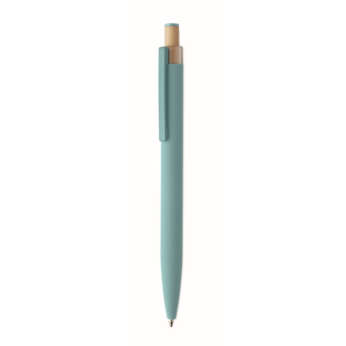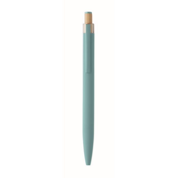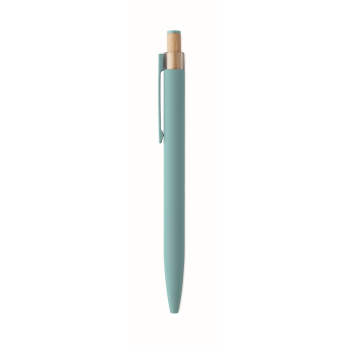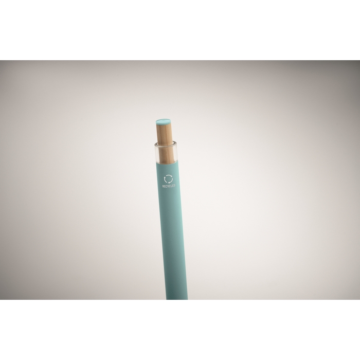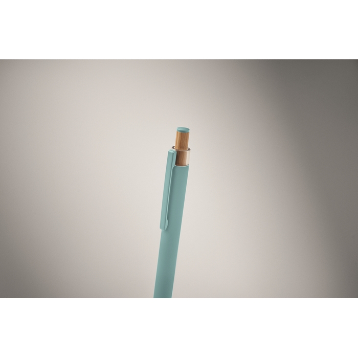 Propiska z recyklovaného hliníku s bambusovým tlačítkem a barevně sladěným kovovým klipem. Modrý inkoust.Rozměry: O1 x 14cm