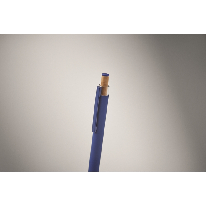 Propiska z recyklovaného hliníku s bambusovým tlačítkem a barevně sladěným kovovým klipem. Modrý inkoust.Rozměry: O1 x 14cm