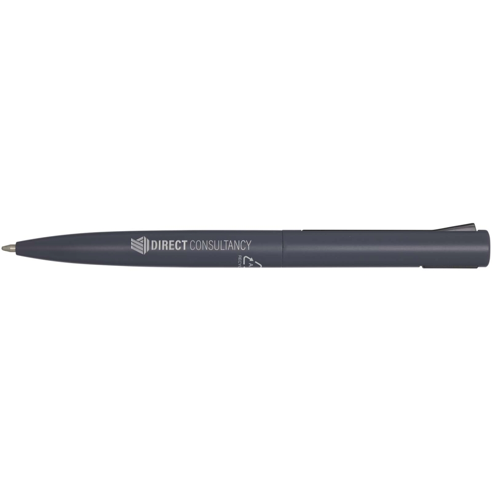 Propiska s horní částí těla vyrobenou z recyklovaného plastu a spodní částí z recyklovaného hliníku. Spona je vyrobena ze železa. Barva inkoustu: Modrá. Délka psaní: 1000 metrů. Rozměr hrotu: 1,0 mm. Rozměry: 14,5 x O 1,5 cm