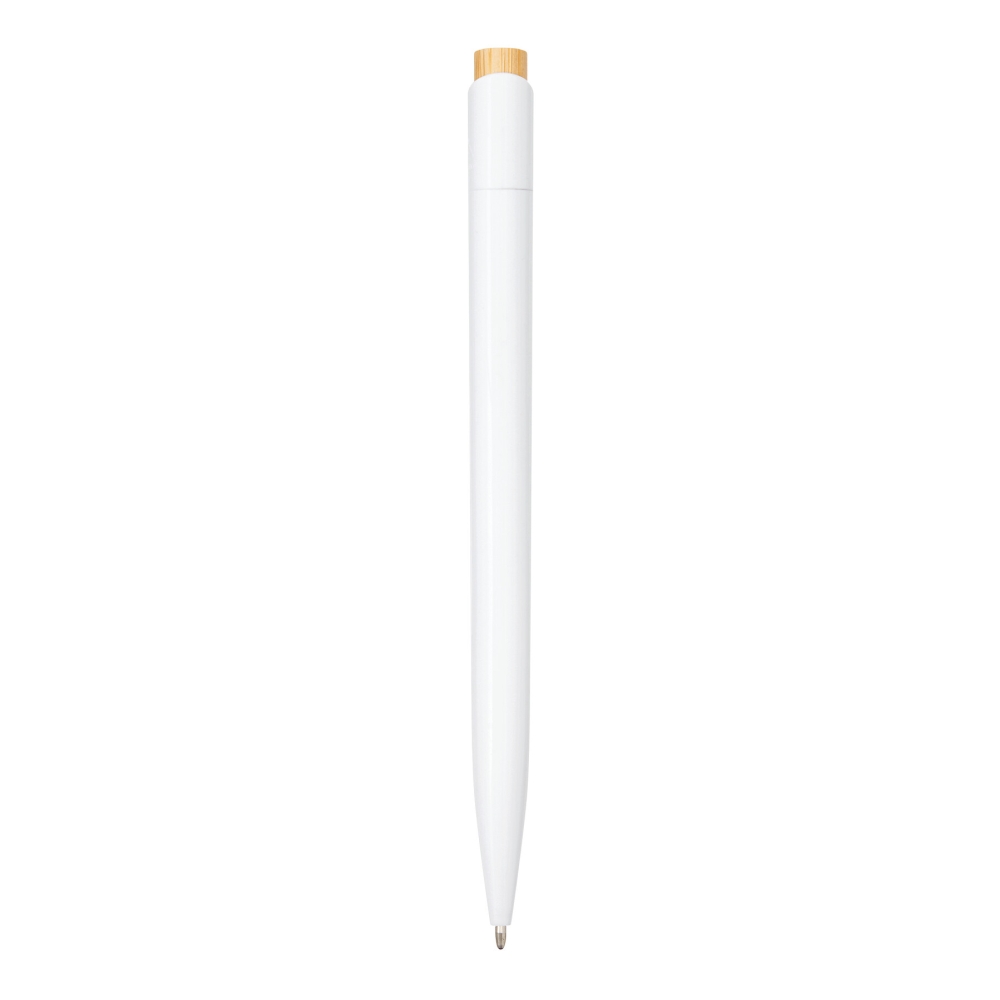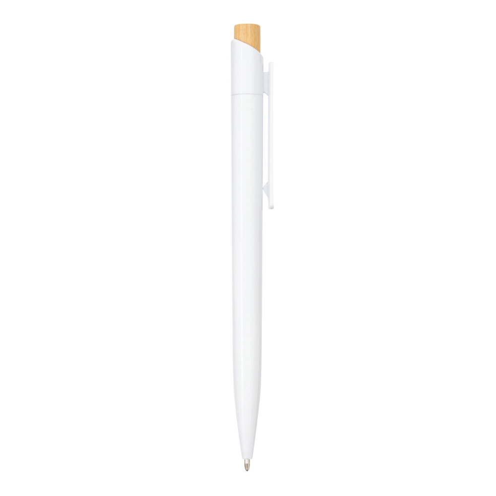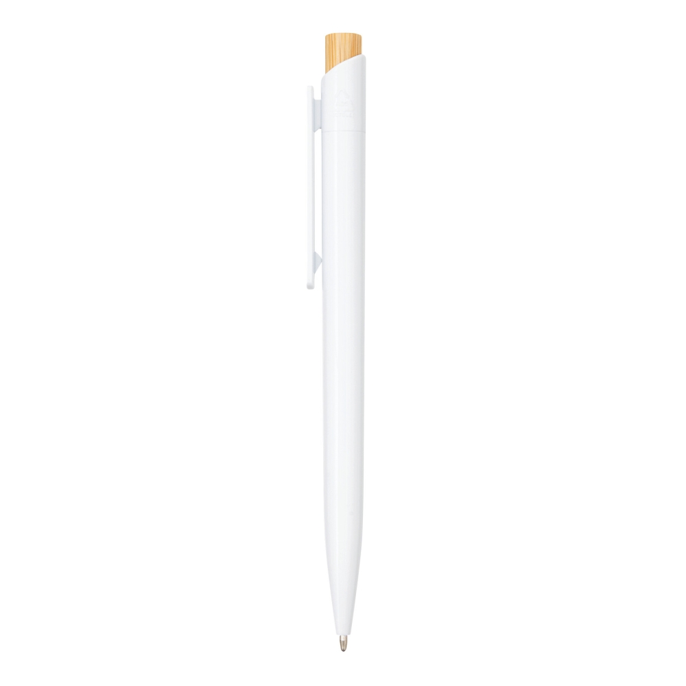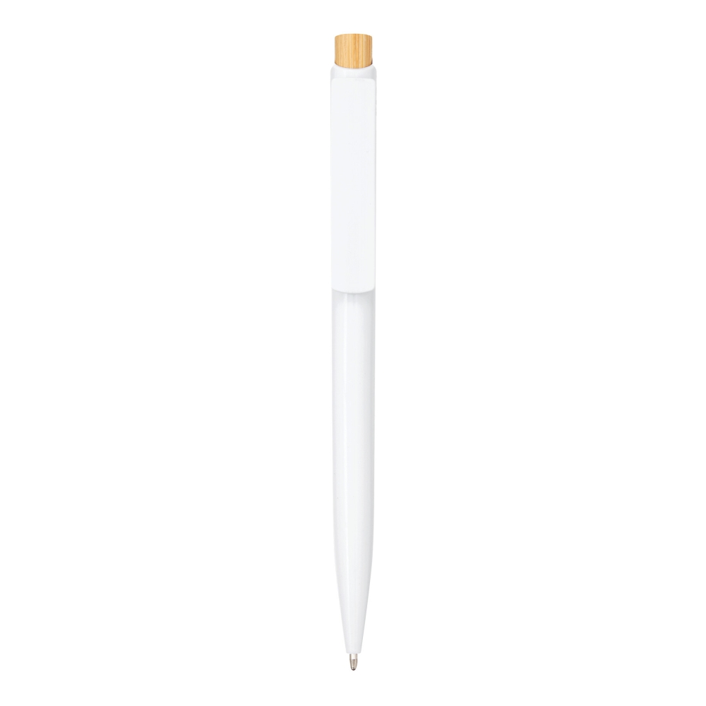 Propiska, tělo z recyklovaného plastu, tlačítkový mechanismus, tlačítko z bambusu, modrý inkoust. Rozměry: 13,5 cm