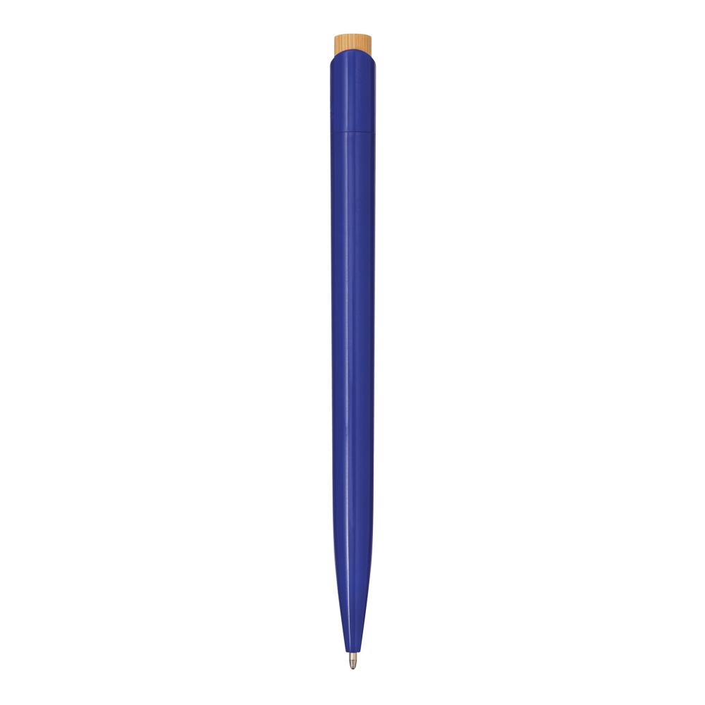 Propiska, tělo z recyklovaného plastu, tlačítkový mechanismus, tlačítko z bambusu, modrý inkoust. Rozměry: 13,5 cm