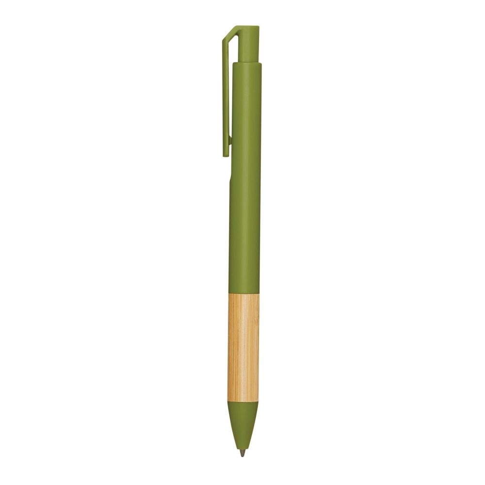 Propiska, tělo z recyklovaného plastu, tlačítkový mechanismus, lakovaná bambusová úchopová plocha, modrý inkoust. Rozměry: 14,3 cm