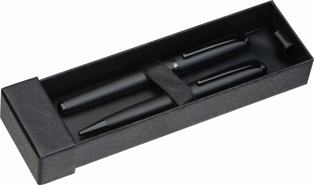 Psací souprava značky Mark Twain. Sada obsahuje roller a kovové kuličkové pero s černým matným tělem a lesklými černými detaily. Dodáváno v dárkové krabičce. Rozměry: 19,4 x 5,7 x 3 cm