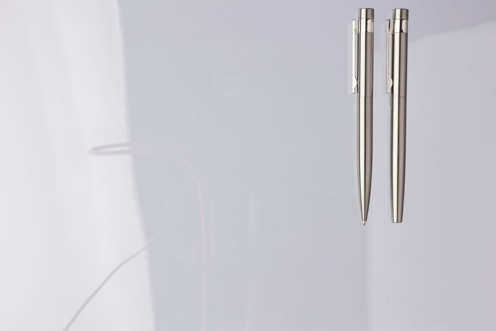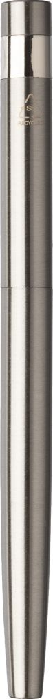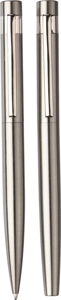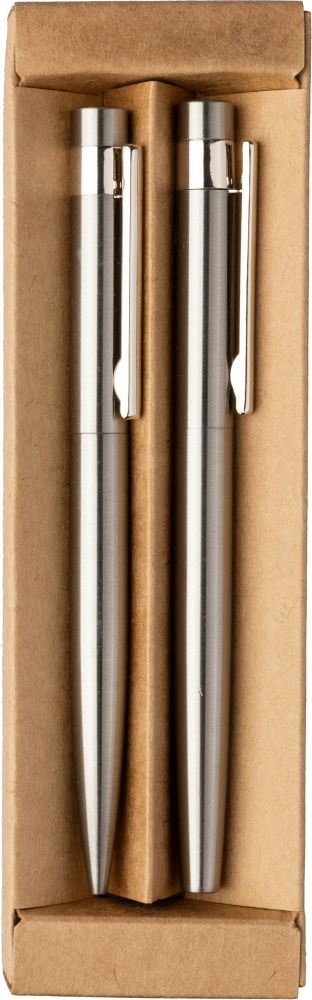 Sada psacích potřeb z recyklované nerezové oceli. Obsahuje kuličkové pero s otočným mechanismem a roller, obě pera mají modrou náplň. Baleno v kraftové papírové krabičce. Rozměry: 17,2 × 5,2 × 2,2 cm.