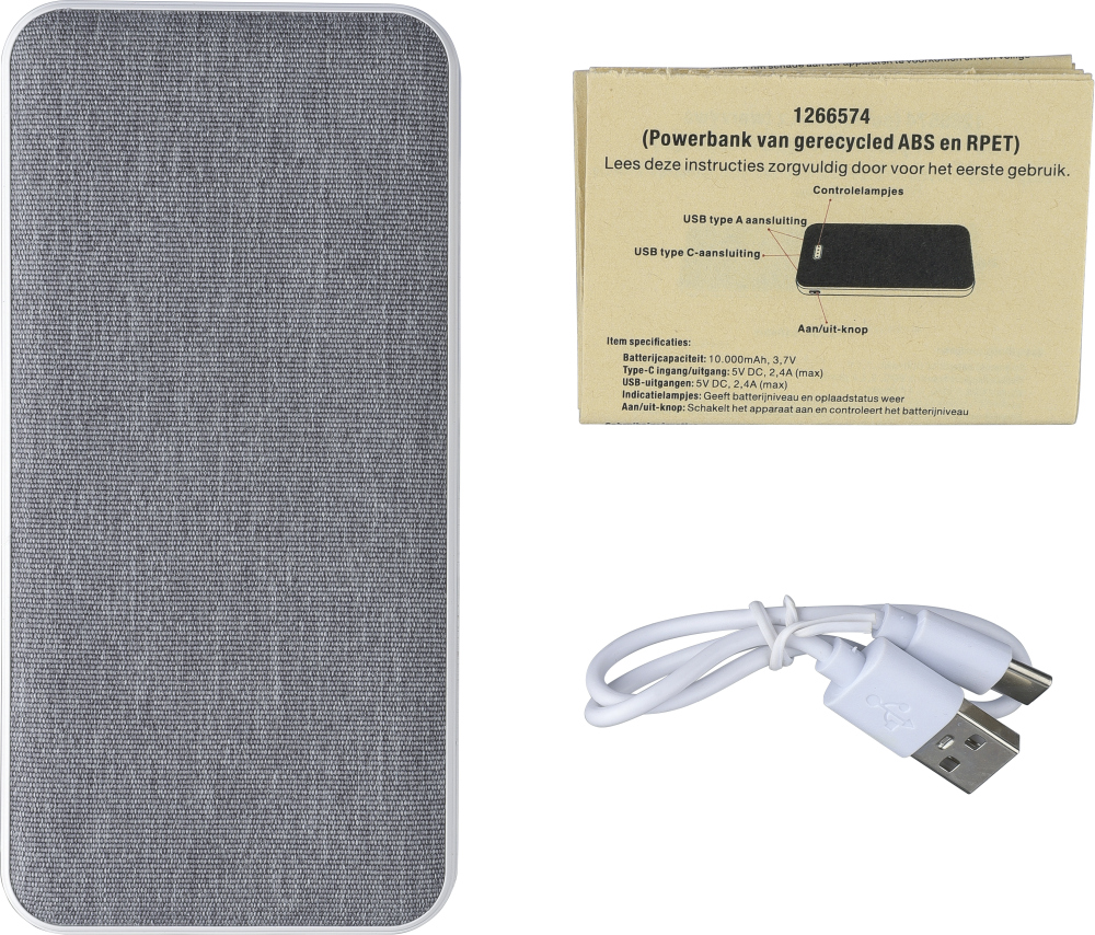 Powerbanka z recyklovaného ABS a rPET plastu s kapacitou 10 000 mAh a životností nejméně 500 nabití. Vybavena dvěma USB výstupy a jedním portem typu C pro vstup i výstup (5V DC/2,4A, 12W). Disponuje indikátorem nabíjení a logem rPET na horní straně. Součástí balení je bílý 30cm nabíjecí kabel. Jednotlivě baleno v hnědé kartonové krabici. Rozměry: 10 x 6,7 x 1,4 cm