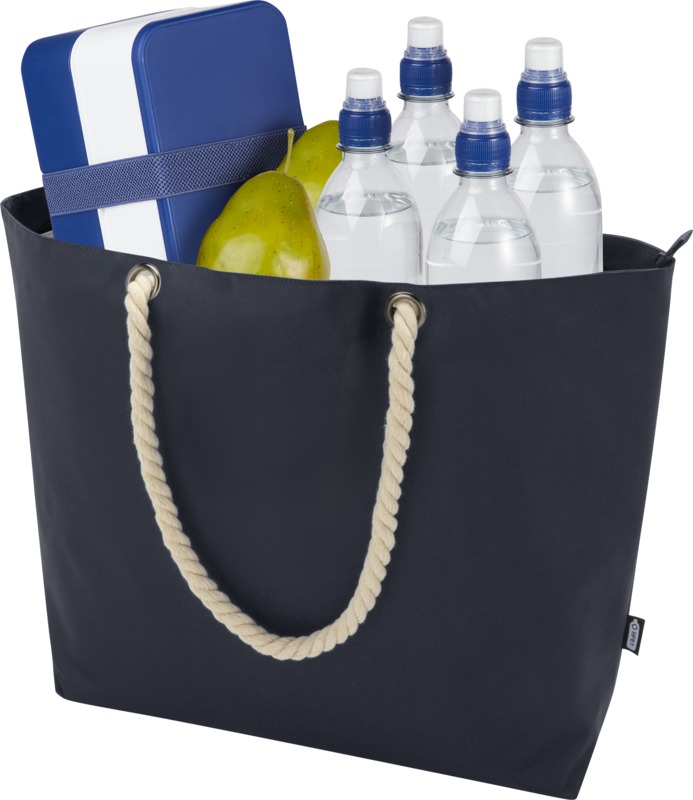 Chladicí plážová a nákupní taška vyrobená z GRS certifikovaného recyklovaného polyesteru. Má velkou hlavní přihrádku na zip a bavlněné šňůry. Objem 23 litrů, nosnost do 10 kg hmotnosti. Neobsahuje PVC. Rozměry: 55 × 15 × 39 cm.
