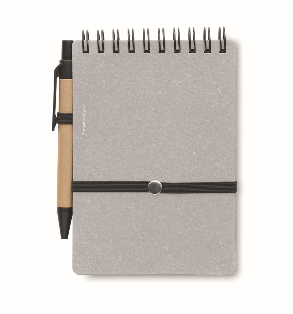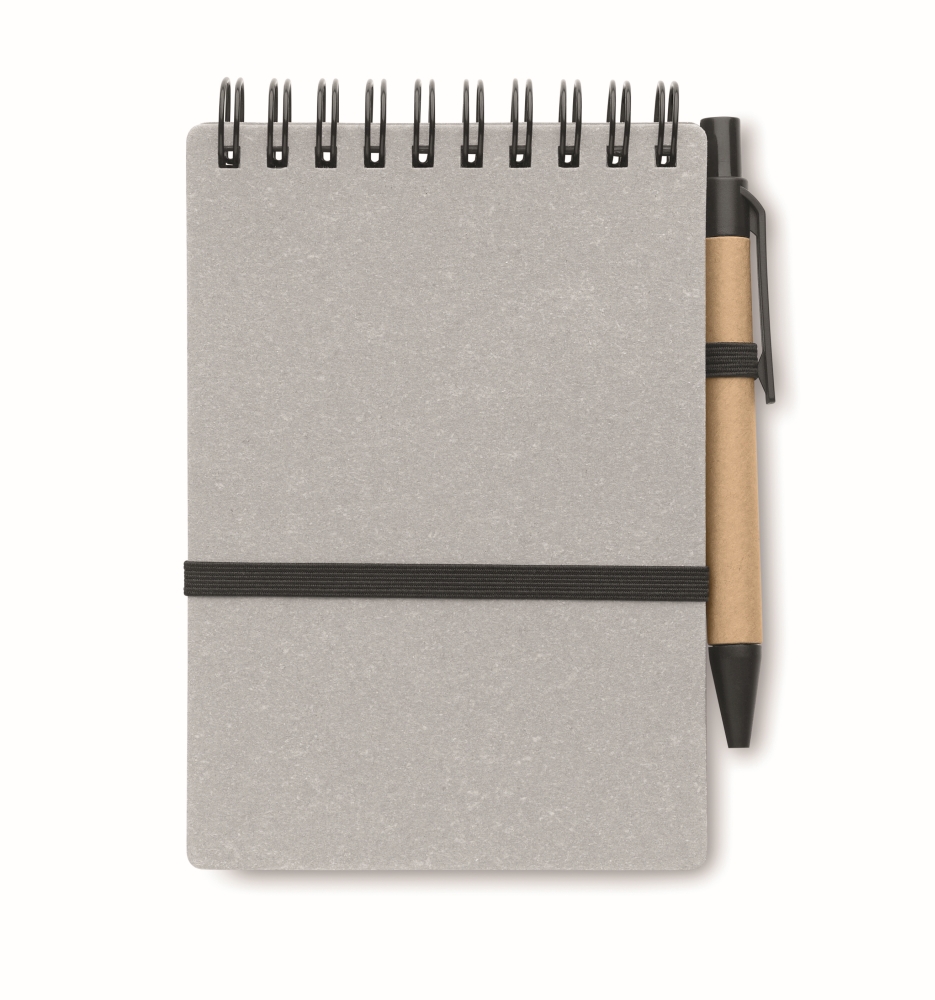 Zápisník z recyklovaného papíru s PU deskami (70 % recyklovaného papíru a 30 % PU). Kroužková vazba. 140 stran linkovaného recyklovaného papíru (70 listů). Odpovídající propiska z recyklovaného papíru a ABS plastu. Modrý inkoust. Elastický uzavírací pásek a poutko na pero. Rozměr 9x13cm. Rozměry: 9 x 13 cm