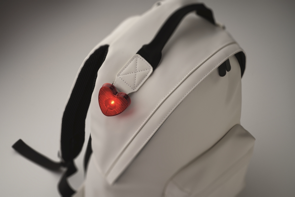 Červené reflektorové světlo ve tvaru srdce z ABS se zadním klipem. Dva režimy svícení: jasné světlo/blikání. Včetně 2 vyměnitelných baterií LR44. Rozměry: 5 x 5 x 1,6 cm. Materiál: ABS