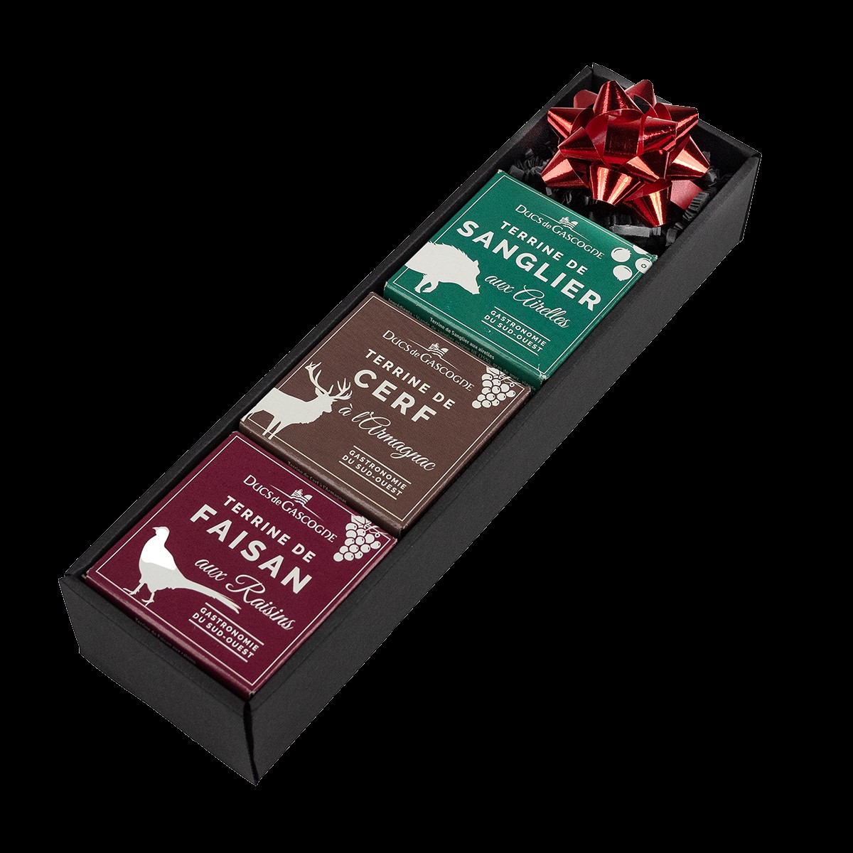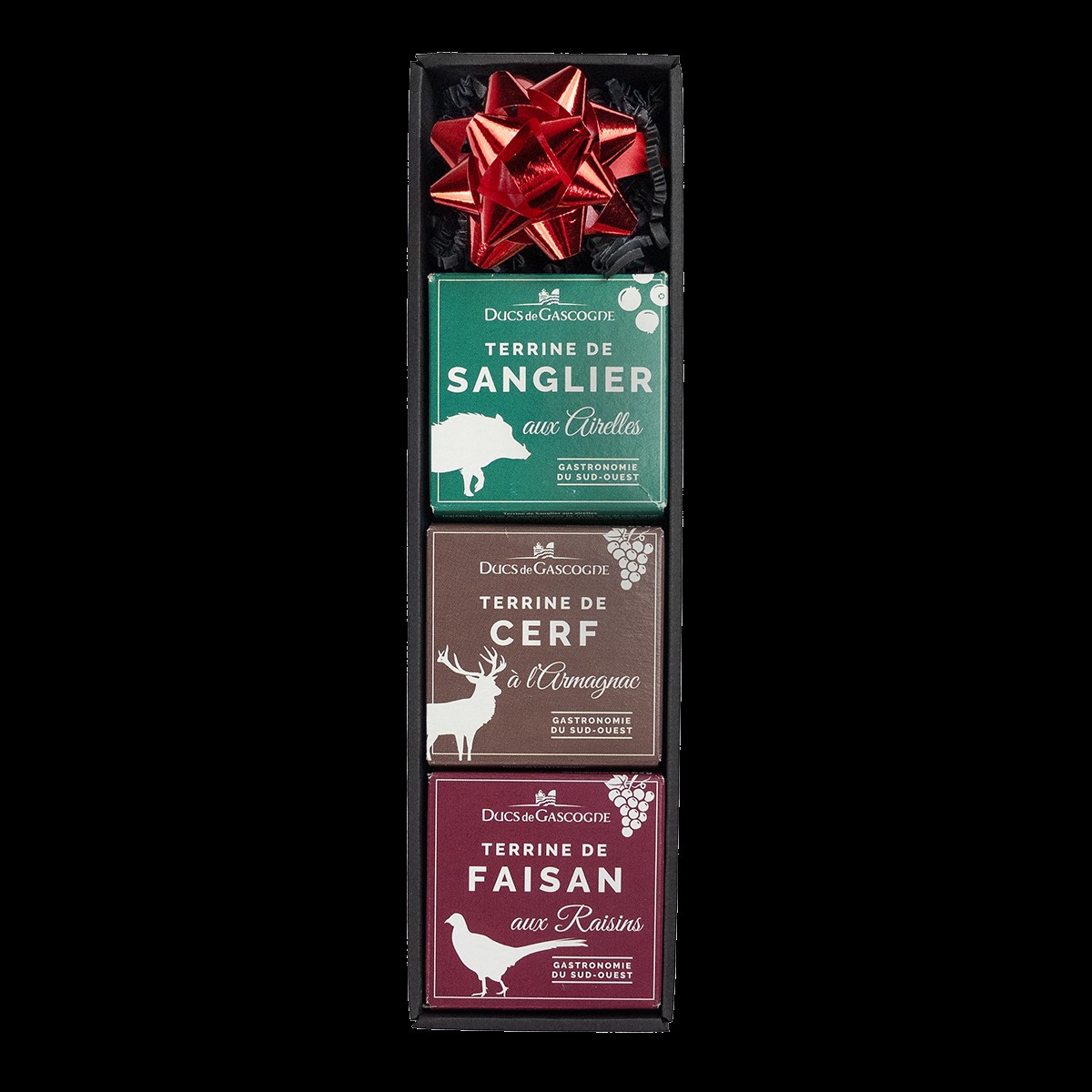 Dárková sada obsahuje tři klasické teriny Ducs de Gascogne. Jelení terinu s Armagnacem 65 g, Kančí terinu s brusinkami 65 g a Bažantí terinu s rozinkami 65 g. Termín dodání: 10 dnů. Rozměry: 23,7 × 5,4 × 5 cm.