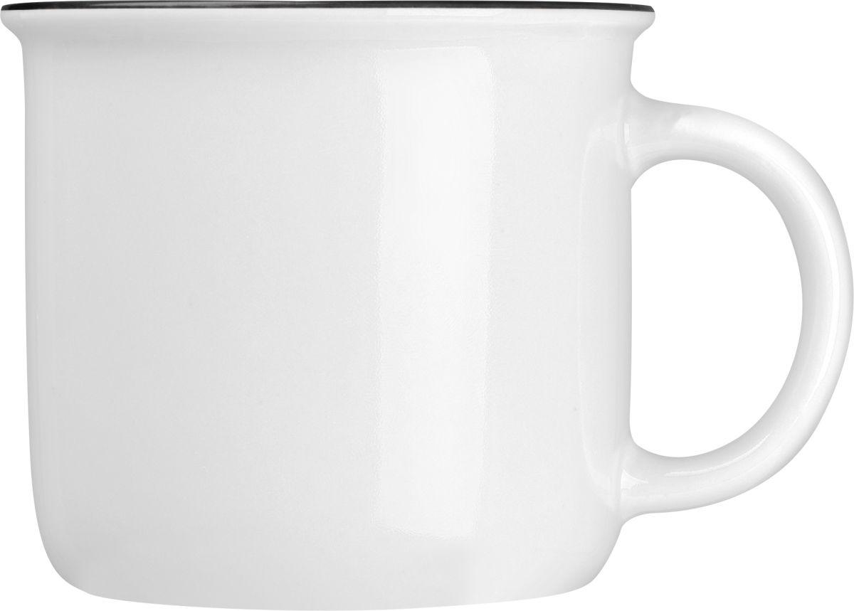 Keramický hrnek o objemu 350 ml v designu smaltovaného hrníčku. Rozměry: O 8,9 × 8,2 cm.