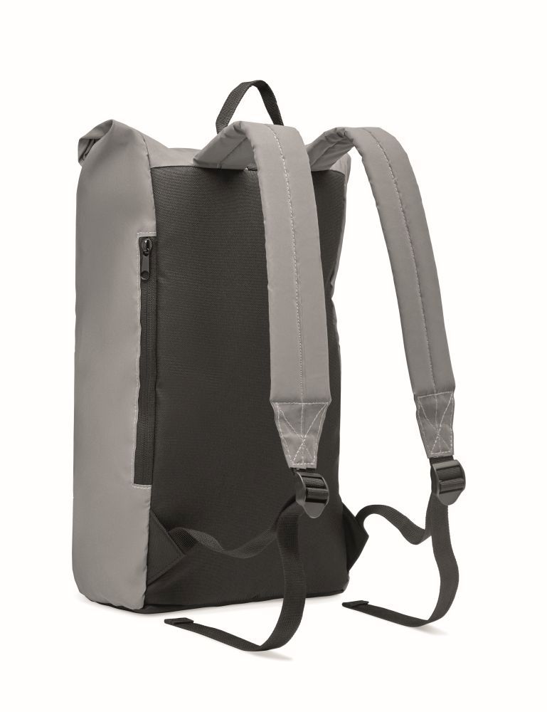 Rolovací batoh z vysoce reflexního polyesteru 190T pro 15 palcový notebook. Vnitřní strana se zapínáním na suchý zip. Polstrovaná záda, popruhy a dno. Přední kapsa na zip. Spodní část z recyklovaného polyesteru 600D. Rozměry: 26x66x13cm