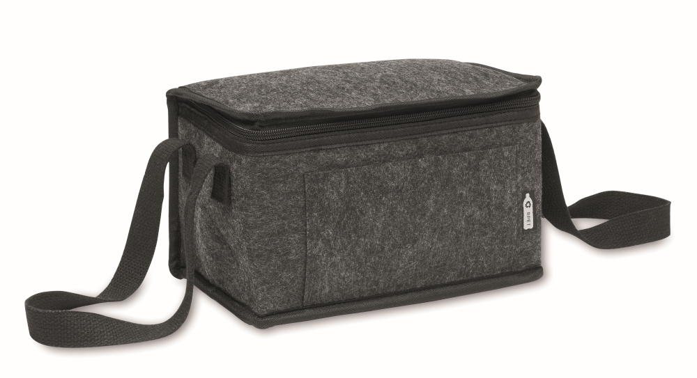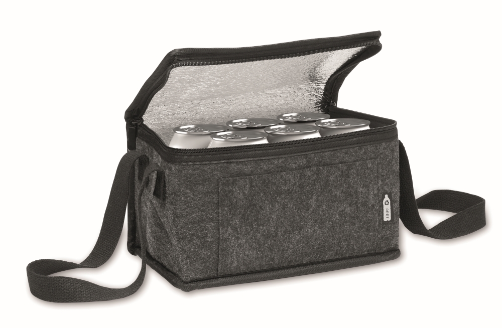 Chladicí taška z RPET plsti s přední kapsou. 1mm RPET plsť a 3mm izolační hliníková laminovaná fólie. Objem: 5L. Rozměry: 25 x 15,5 x 14,5 cm