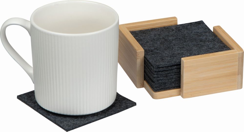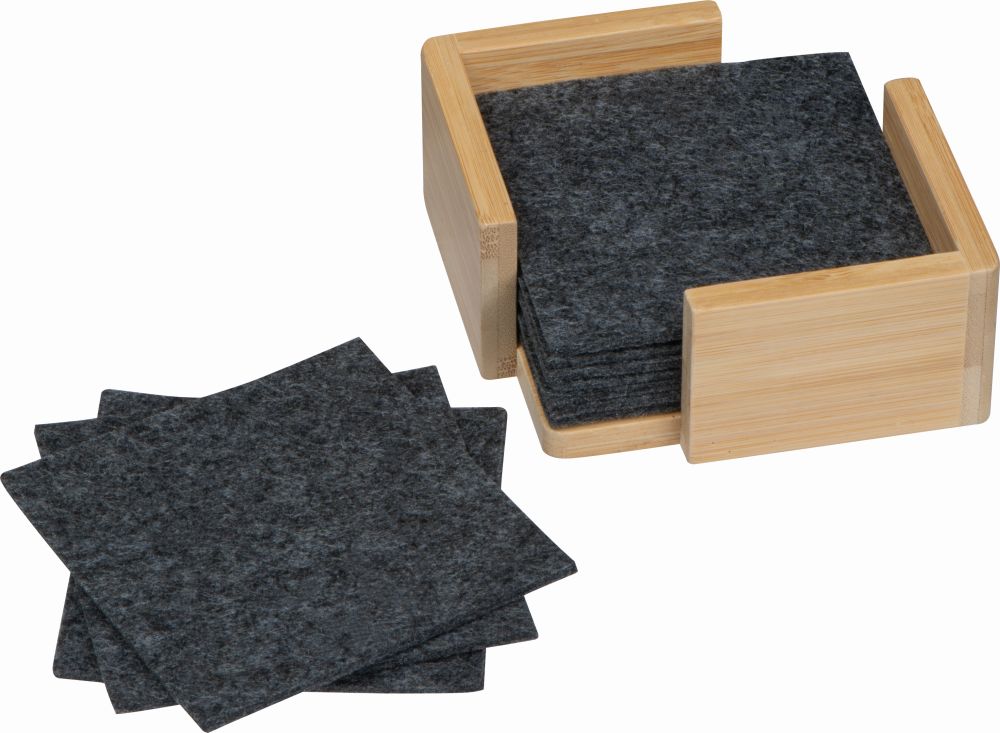Sada 15 plstěných podtácků v bambusovém stojánku. Podtácky jsou čtvercové, vyrobené z RPET. Rozměry: 10,8 x 10,8 x 4,5 cm