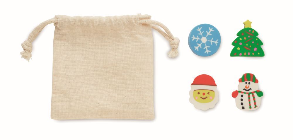 Sada 4 různých vánočních gum: sněhová vločka, Santa, vánoční stromeček a sněhulák. Baleno v bavlněném sáčku se stahovací šňůrkou. Rozměry: 8x8cm